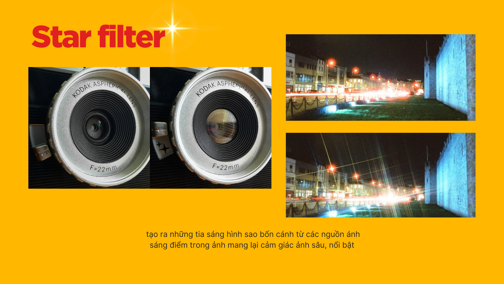Star-Filter: Khi bật star-filter, lens máy sẽ được phủ lên hiệu ứng giúp tạo tia sáng 4 cánh khi chụp vào những nguồn sáng nhỏ (ánh đèn, ánh sáng dưới mặt hồ nước,...).