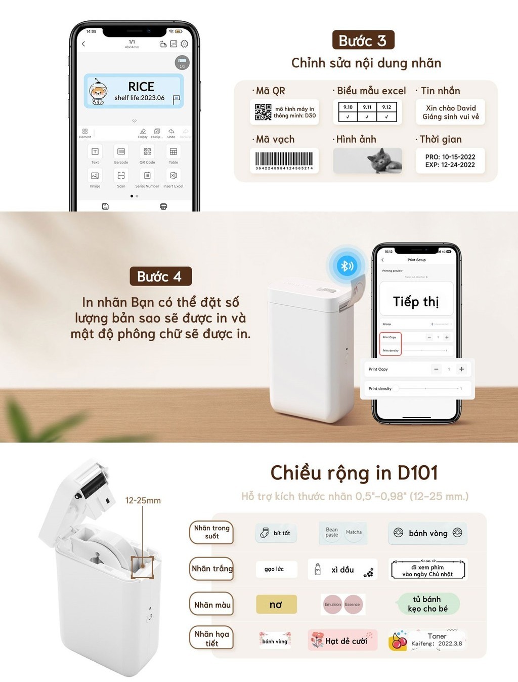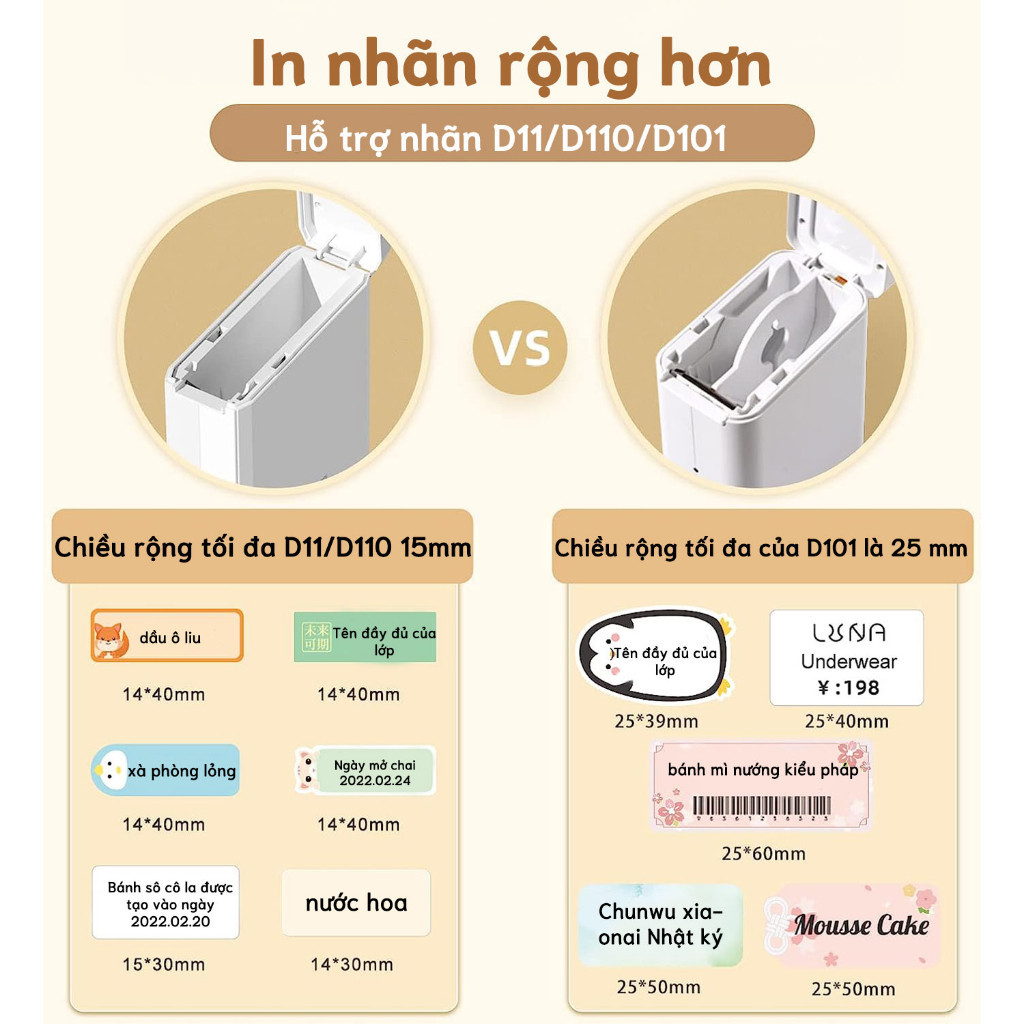- D101 sử dụng nhãn dán D-series và những nhãn có độ rộng tối đa 25mm (so với D110 chỉ sử dụng nhãn tối đa 15mm). Xem thêm TẠI ĐÂY.
