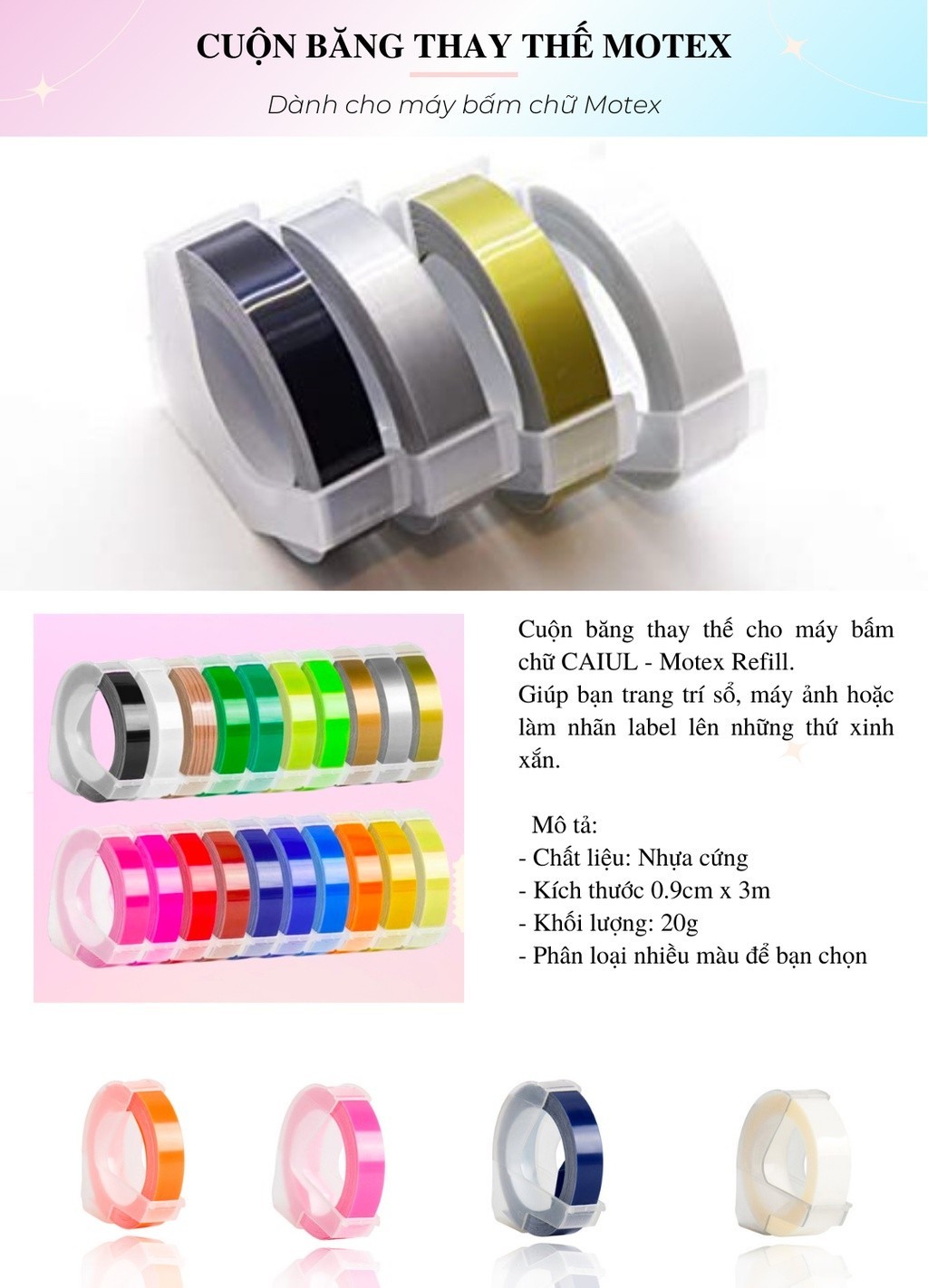 Cuộn băng thay thế cho máy bấm chữ CAIUL - Motex Refill. Giúp bạn trang trí sổ, máy ảnh hoặc làm nhãn label lên những thứ xinh xắn.