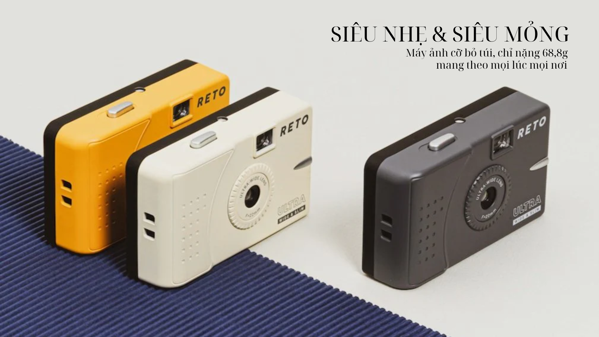 RETO Ultra Wide & Slim là dòng máy ảnh phim 35mm, nổi bật với thiết kế siêu mỏng, siêu nhẹ. Máy hướng đến trải nghiệm chụp film đơn giản – nhanh – vui, rất phù hợp cho newbie hoặc những bạn muốn một chiếc máy gọn nhẹ để mang theo hằng ngày.