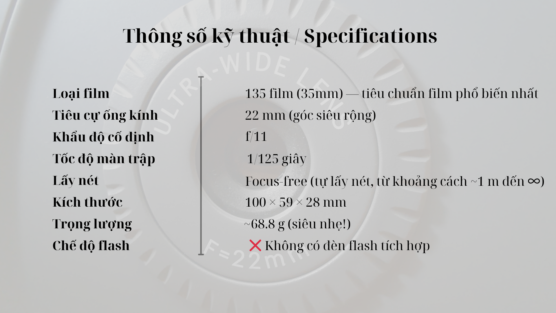 Máy được trang bị ống kính 22mm f/11, cho góc nhìn rộng so với các máy film thông thường, tạo cảm giác phóng khoáng.